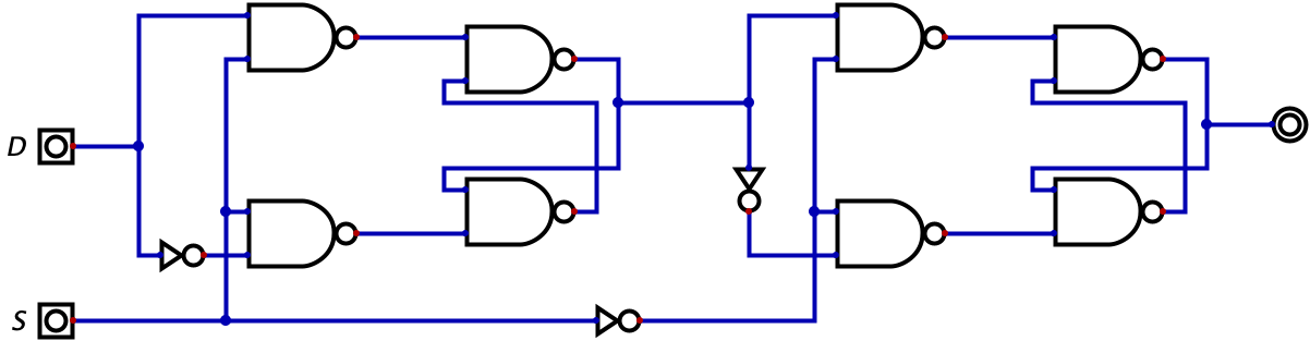 As you may have guessed, this circuit is popular enough to have a name: the flip-flop. And even more interestingly, it turns out we can built a flip-flop by using two latches. That’s right, the shortcoming we identified with the latch can be fixed by simply using two latches. This circuit, as was the case with the latch in Chapter 10, is hard to conceptualize. So, I will give you the circuit below, let you try to reason through it, and then I will offer an explanation to help your conceptualization.
